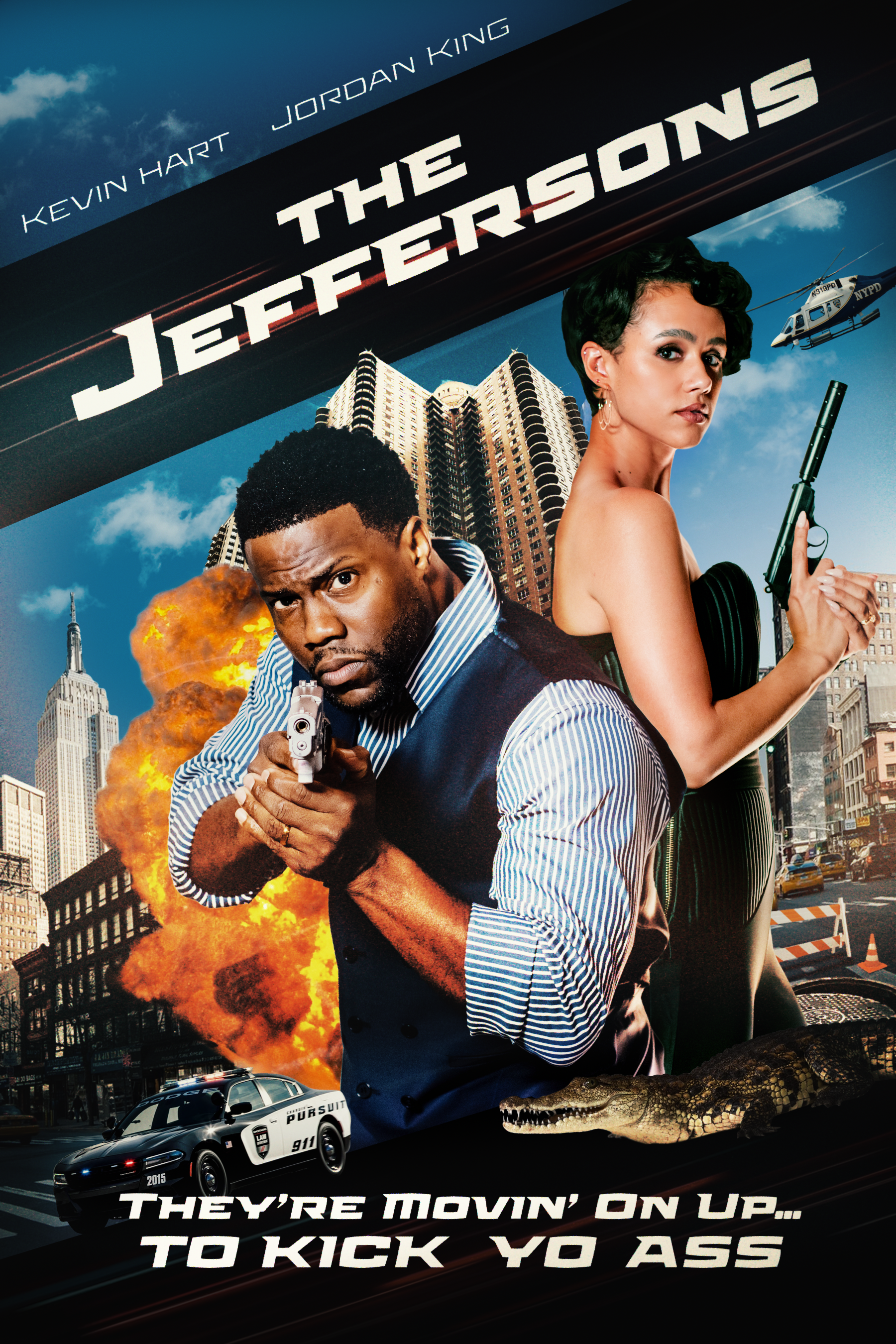 Kevin's character has finally arrived as a superstar, and the world around him needed to reflect that. I designed original key art for The Jeffersons, a fictional action reboot starring Kevin's character—a movie-within-a-movie that appears on billboards throughout the show.